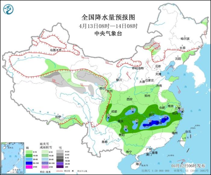 4月12日08時至13日08時,內蒙古東北部、黑龍江西北部、新疆沿天山地區(qū)、青海北部和南部等地部分地區(qū)有小雪或雨夾雪。黑龍江東北部、新疆南疆盆地、西北地區(qū)東南部、華北中南部、黃淮東部、江淮西南部、江漢大部、江南、西南地區(qū)東部、華南大部、臺灣島等地部分地區(qū)有小到中雨,其中,安徽西南部、湖北東部、湖南中部、江西中北部、貴州東北部等地部分地區(qū)有大雨(25~45毫米)。內蒙古中西部、黑龍江東北部、新疆北疆北部、青海西部、甘肅河西、浙江北部等地部分地區(qū)有4~6級風,其中,新疆東部部分地區(qū)有6~7級風。渤海、渤海海峽、東海大部海域、臺灣海峽、巴士海峽、南海東北部海域將有5~6級風、陣風7~8級。