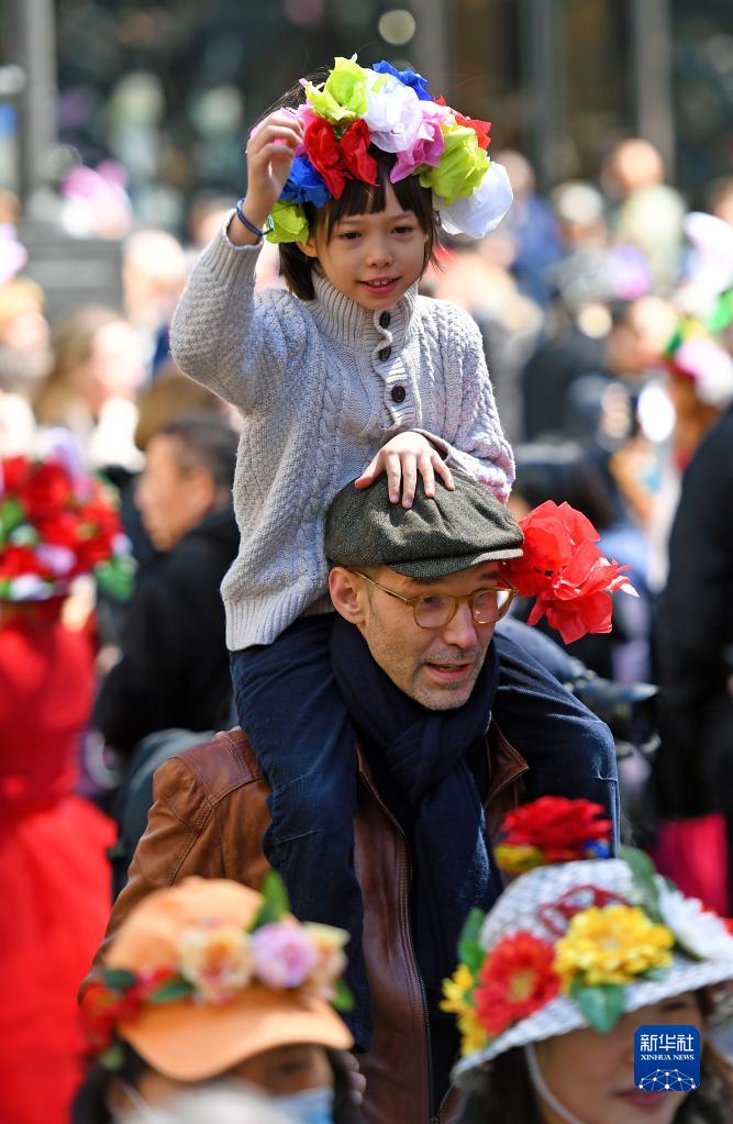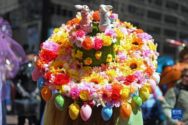 當(dāng)日是西方傳統(tǒng)節(jié)日復(fù)活節(jié),人們頭戴精心制作的花帽,在紐約第五大道參加一年一度的復(fù)活節(jié)游行。