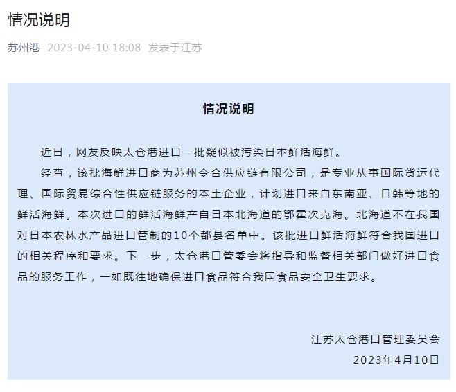 中新網(wǎng)4月11日電 據(jù)江蘇太倉(cāng)港口管理委員會(huì)微信公眾號(hào)消息,近日,網(wǎng)友反映太倉(cāng)港進(jìn)口一批疑似被污染日本鮮活海鮮。