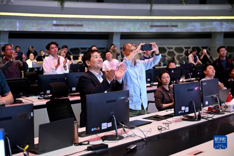 4月12日,在全超導托卡馬克核聚變實驗裝置(EAST)控制大廳,科研人員在實驗成功后慶祝。新華社記者 黃博涵 攝