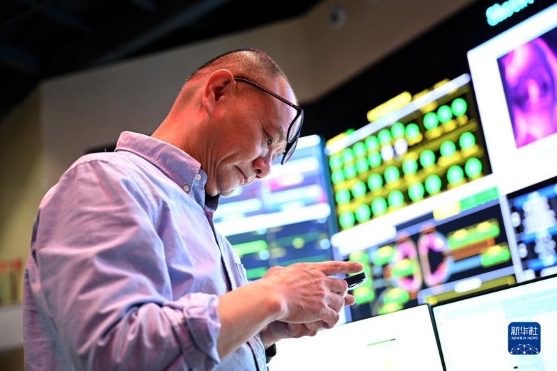 4月12日,EAST物理實驗總負責人龔先祖注視著實驗成功后的數(shù)據(jù)。新華社記者 張端 攝