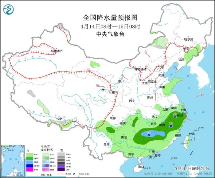 4月13日08時(shí)至14日08時(shí),內(nèi)蒙古東北部和中部、黑龍江西北部、新疆南疆盆地南部、西藏南部、青海大部、甘肅中南部和河西等地部分地區(qū)有小到中雪或雨夾雪,其中,青海東部、甘肅河西等地局地有大到暴雪(10~15毫米)。四川盆地西南部、西南地區(qū)東南部、江淮西部、江漢東部、江南北部等地部分地區(qū)有中到大雨,其中,湖南中西部和北部、江西北部等地部分地區(qū)有暴雨(50~80毫米)。內(nèi)蒙古中西部、吉林西部、遼寧大部、西北地區(qū)中東部、華北大部、山東半島等地部分地區(qū)有4~6級(jí)風(fēng),其中,西藏北部部分地區(qū)有7~8級(jí)風(fēng)。