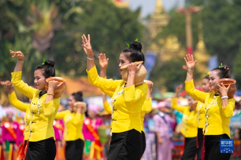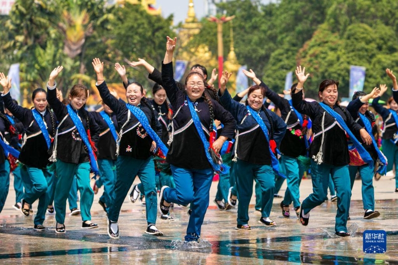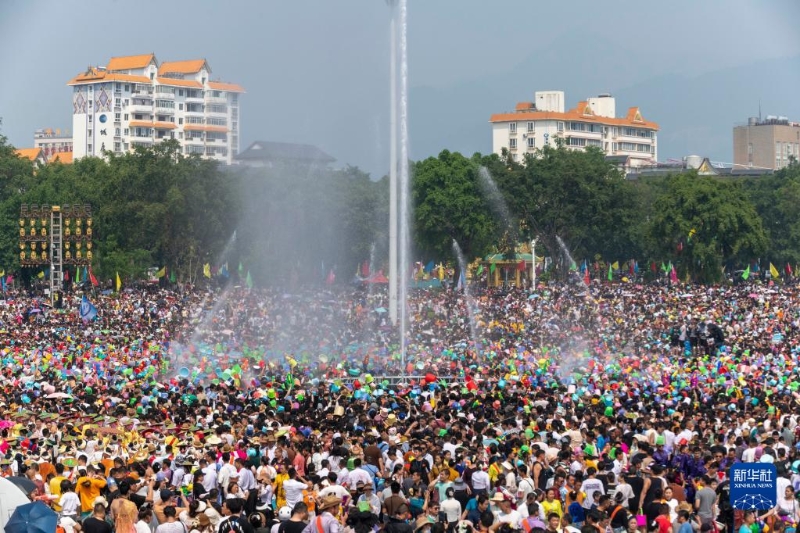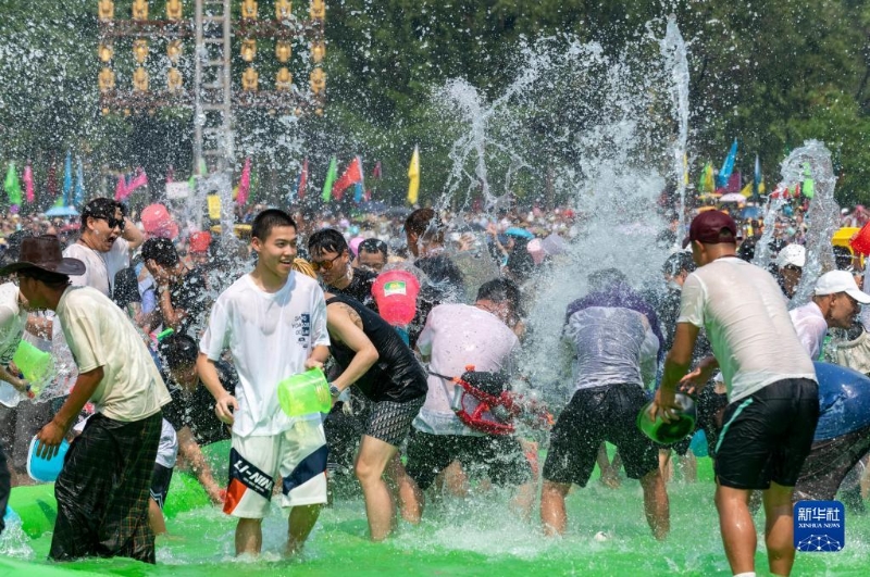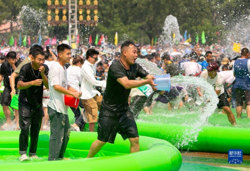 當(dāng)日,云南省德宏傣族景頗族自治州芒市2023年潑水狂歡節(jié)開幕,人們相互潑灑代表幸福、吉祥的清水,表達(dá)著相互間的無限祝福。