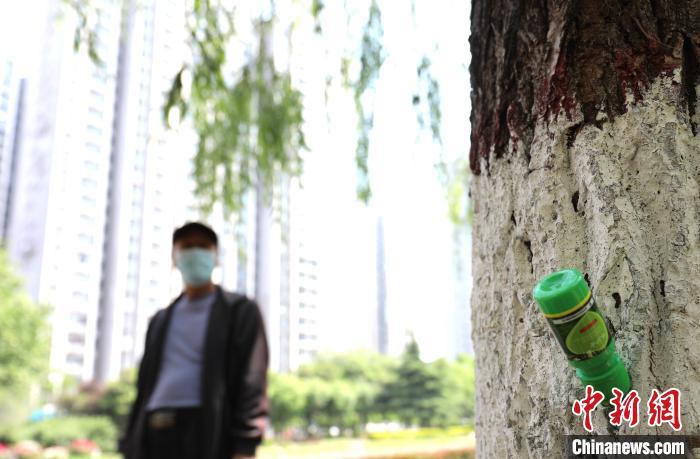 邯鄲市園林技術(shù)人員早在2015年就開(kāi)始研制配方,在“抑花一號(hào)”化學(xué)粉劑的基礎(chǔ)上,加入一定比例的酒精和水,注入營(yíng)養(yǎng)液袋后,通過(guò)針頭注入樹(shù)體。2016年通過(guò)瓶裝制劑赤霉素,在治理現(xiàn)場(chǎng)直接鉆孔“插瓶”即可使用。去年,經(jīng)過(guò)治理,該市飛絮量比2015年治理前減少了90%以上。