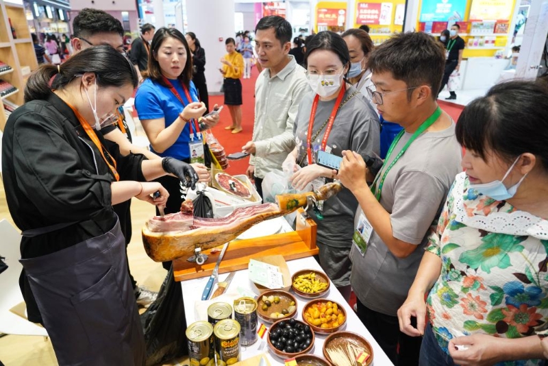 4月12日,參觀者在第三屆消博會(huì)現(xiàn)場(chǎng)品嘗產(chǎn)自西班牙的小吃。新華社記者樊雨晴 攝