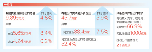 1月份,受春節(jié)假期影響,進出口下降7%。2月“由負轉(zhuǎn)正”,當(dāng)月增長8%,3月同比增速提升到15.5%,呈現(xiàn)逐月向好態(tài)勢。一季度整體增長4.8%,較去年四季度提速2.6個百分點。
