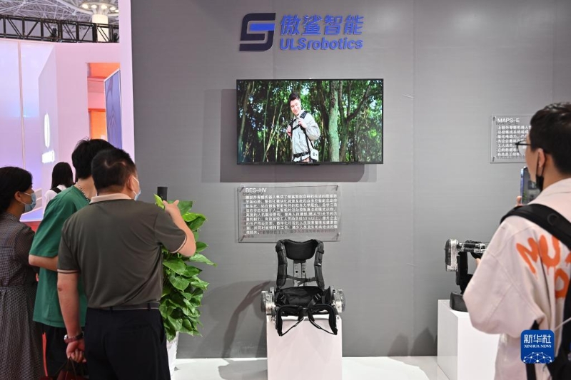 4月13日,參觀者在上海展臺(tái)了解一款腰部外骨骼機(jī)器人產(chǎn)品。