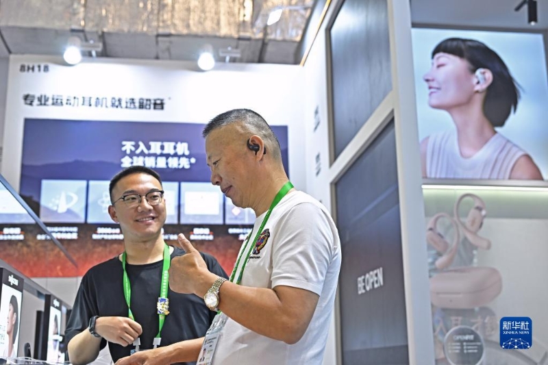 4月13日,一名參觀者在韶音展臺(tái)試聽(tīng)該公司在消博會(huì)發(fā)布的新品不入耳藍(lán)牙耳機(jī),并為產(chǎn)品點(diǎn)贊。