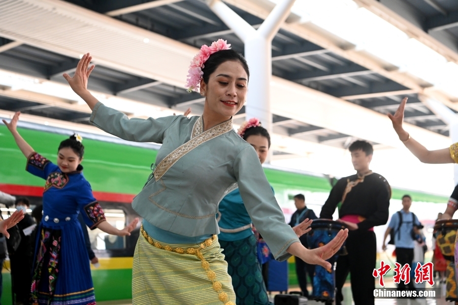 北京時(shí)間4月13日8時(shí)8分,D887次“復(fù)興號(hào)”動(dòng)車組從中國(guó)昆明南站出發(fā),將于10小時(shí)30分后到達(dá)萬(wàn)象站。北京時(shí)間9時(shí)8分,D888次“瀾滄號(hào)”動(dòng)車組從老撾萬(wàn)象站出發(fā),將在當(dāng)日19時(shí)38分到達(dá)昆明南站。這標(biāo)志著中老鐵路國(guó)際旅客列車正式開行,中國(guó)昆明和老撾萬(wàn)象之間實(shí)現(xiàn)朝發(fā)夕至。圖為身著民族服飾的列車員為旅客帶來(lái)特色節(jié)目。中新社記者 李嘉嫻 攝