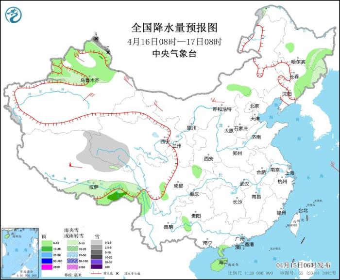 4月15日08時至16日08時,新疆北疆東北部和沿天山地區(qū)、西藏中部、內(nèi)蒙古東部、黑龍江東部、遼寧東部等地部分地區(qū)有小到中雪或雨夾雪,其中,新疆阿勒泰北部等地部分地區(qū)有大到暴雪(10~18毫米)。新疆北部、吉林東部和南部、黃淮東部、江淮東部、福建東部、云南東部、華南南部、臺灣島等地部分地區(qū)有小到中雨,局部地區(qū)有大雨。內(nèi)蒙古中西部、新疆伊犁河谷、西北地區(qū)中北部、華北西部和南部、遼寧西部等地部分地區(qū)有4~6級風(fēng),其中,新疆沿天山地區(qū)、甘肅河西等地部分地區(qū)有6~7級風(fēng)。東海大部、臺灣以東洋面有5~7級風(fēng)、陣風(fēng)8級(見圖2)。