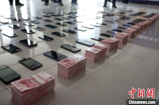 圖為警方查獲的涉案手機(jī)和資金?!“⒗泼斯补﹫D