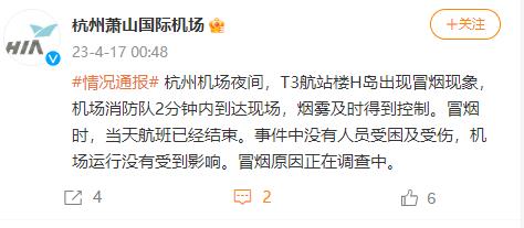 中新網(wǎng)4月17日電 杭州蕭山國(guó)際機(jī)場(chǎng)官方微博17日凌晨發(fā)布情況通報(bào):杭州機(jī)場(chǎng)夜間,T3航站樓H島出現(xiàn)冒煙現(xiàn)象,機(jī)場(chǎng)消防隊(duì)2分鐘內(nèi)到達(dá)現(xiàn)場(chǎng),煙霧及時(shí)得到控制。冒煙時(shí),當(dāng)天航班已經(jīng)結(jié)束。事件中沒(méi)有人員受困及受傷,機(jī)場(chǎng)運(yùn)行沒(méi)有受到影響。冒煙原因正在調(diào)查中。