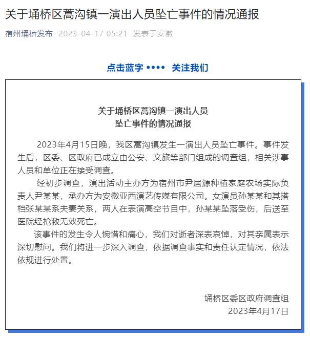 中新網(wǎng)4月17日電 據(jù)“宿州埇橋發(fā)布”微信公眾號(hào)消息,17日,安徽宿州埇橋區(qū)委區(qū)政府調(diào)查組就演出人員墜亡事件發(fā)布通報(bào)。通報(bào)顯示,女演員孫某某和其搭檔張某某系夫妻關(guān)系,兩人在表演高空節(jié)目中,孫某某墜落受傷,后送至醫(yī)院經(jīng)搶救無(wú)效死亡。相關(guān)涉事人員和單位正在接受調(diào)查。