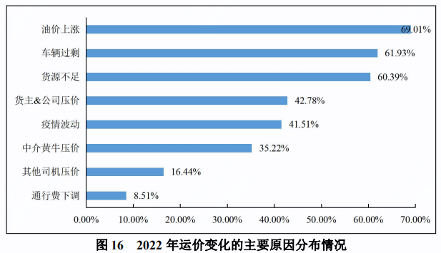 《報(bào)告》中提到,運(yùn)價(jià)變化的三個(gè)主要原因分別是:油價(jià)上漲、車(chē)輛過(guò)剩加劇市場(chǎng)低價(jià)競(jìng)爭(zhēng)、貨源不足拉低整體價(jià)格。首先,油價(jià)上漲成為最大成本推手。69.01%的貨車(chē)司機(jī)反映2022年造成運(yùn)價(jià)變化的主要原因?yàn)橛蛢r(jià)上漲。2022年平均油價(jià)上漲幅度約3成,如果按照燃油成本占物流企業(yè)運(yùn)輸總成本30%計(jì)算,總運(yùn)輸成本上漲了約10%。