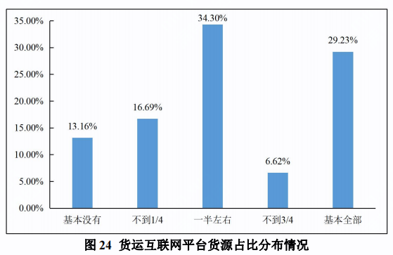 顯然,將運(yùn)價(jià)低簡(jiǎn)單歸因于網(wǎng)絡(luò)貨運(yùn)平臺(tái),這是不公平的。網(wǎng)絡(luò)貨運(yùn)平臺(tái)的出現(xiàn)其實(shí)大大提升了貨車(chē)司機(jī)的工作效率。調(diào)查數(shù)據(jù)顯示,76.01%的貨車(chē)司機(jī)使用過(guò)網(wǎng)絡(luò)貨運(yùn)平臺(tái),市場(chǎng)普及率較高。在使用過(guò)網(wǎng)絡(luò)貨運(yùn)平臺(tái)的貨車(chē)司機(jī)中,近三成(29.23%)的貨車(chē)司機(jī)反映貨源基本來(lái)自網(wǎng)絡(luò)貨運(yùn)平臺(tái),超過(guò)七成(70.15%)的貨車(chē)司機(jī)有一半以上的貨源來(lái)自網(wǎng)絡(luò)貨運(yùn)平臺(tái)。