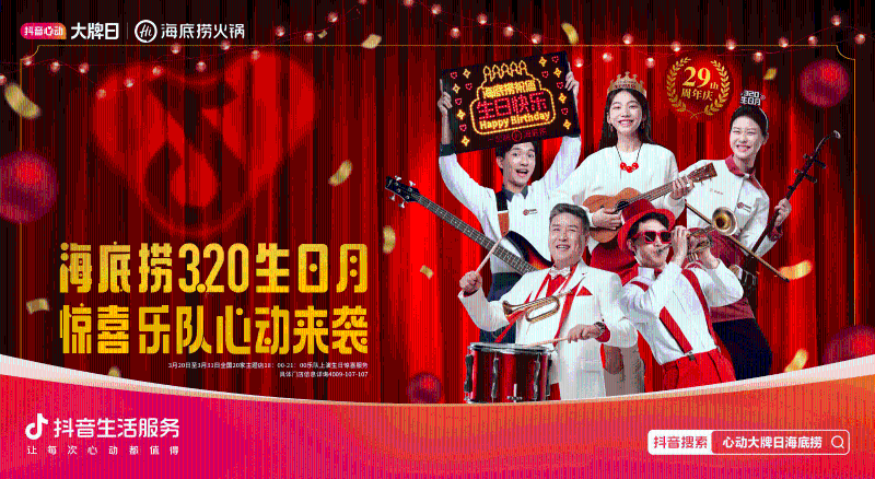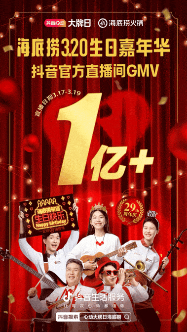 1994年3月20日,第一家海底撈成立,從四川麻將的術(shù)語,走向了匯聚各地火鍋特色為一體大型連鎖餐飲品牌;2012年,海底撈開設(shè)海外第一家分店;2018年,海底撈在港交所主板掛牌上市。2023年,穿越29年的歲月長河,海底撈迎來即將“三十而立”的一年。在面對激烈與風險并存的餐飲市場,海底撈帶著“火鍋”招牌,依舊保持著領(lǐng)先的優(yōu)勢,不斷帶給市場更多的驚喜。在3.20生日嘉年華活動中,海底撈成為抖音首個正餐官方直播破億品牌。讓人不禁思索,在競爭激烈的火鍋賽道,29歲的海底撈如何在抖音生活服務(wù)戰(zhàn)場,拿下品牌和業(yè)績雙重光輝戰(zhàn)果?
