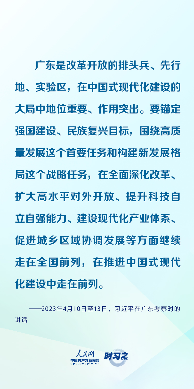 “廣東是改革開放的排頭兵、先行地、實(shí)驗(yàn)區(qū),在中國式現(xiàn)代化建設(shè)的大局中地位重要、作用突出?!?023年4月10日至13日,習(xí)近平先后來到湛江、茂名、廣州等地,深入企業(yè)、港口、農(nóng)村等進(jìn)行調(diào)研。習(xí)近平此次廣東考察,“中國式現(xiàn)代化”一詞貫穿始終。