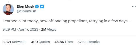 SpaceX公司首席執(zhí)行官馬斯克隨后在推特上發(fā)文稱,“今天學(xué)到了很多,現(xiàn)在卸載推進劑,過幾天再嘗試……”