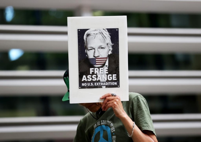 2022年5月17日,一名示威者在倫敦英國內政部大樓門前手舉“釋放阿桑奇”標語。新華社記者李穎攝