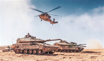 大漠深處,幾輛以色列“梅卡瓦”Mk4主戰(zhàn)坦克靜靜停放著,頭頂上方還有一架“黑鷹”直升機(jī)在盤旋。飛揚(yáng)的煙塵、斑駁的鐵甲似乎暗示著這里剛剛結(jié)束一場(chǎng)鐵甲“狂飆”賽。
