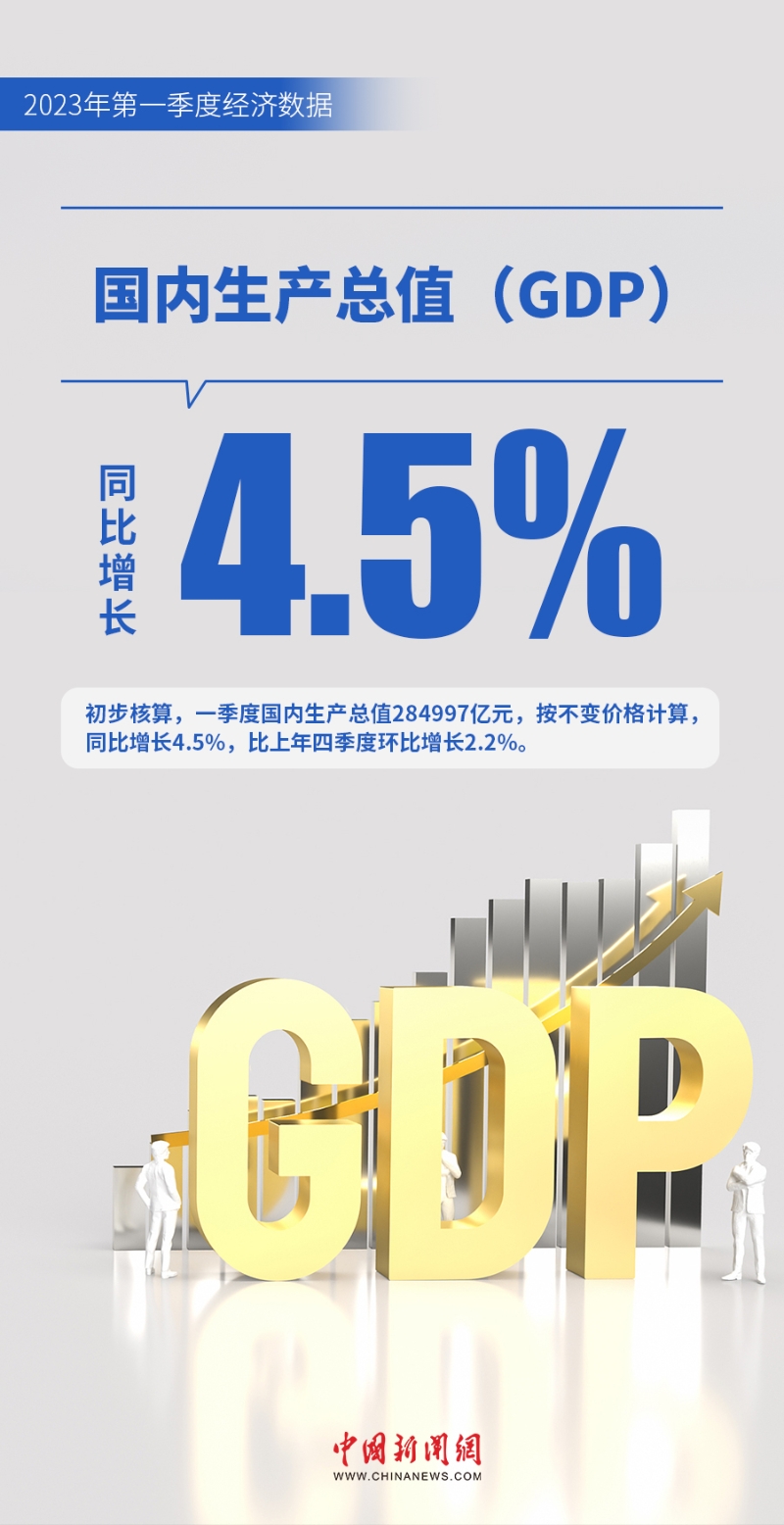 國家統(tǒng)計(jì)局18日公布的數(shù)據(jù)顯示,一季度我國國內(nèi)生產(chǎn)總值284997億元,按不變價(jià)格計(jì)算,同比增長4.5%。