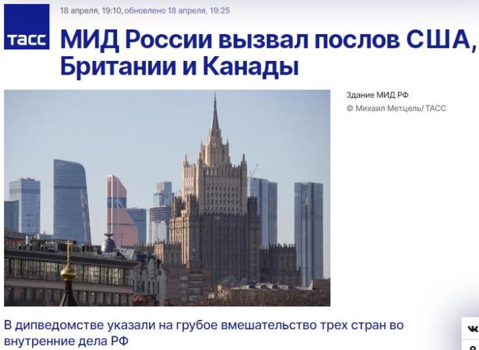 據(jù)報(bào)道,俄外交部表示,“由于粗暴干涉俄羅斯內(nèi)部事務(wù)和從事不符合外交地位的活動(dòng),美國(guó)、英國(guó)和加拿大的大使被俄外交部召見。”