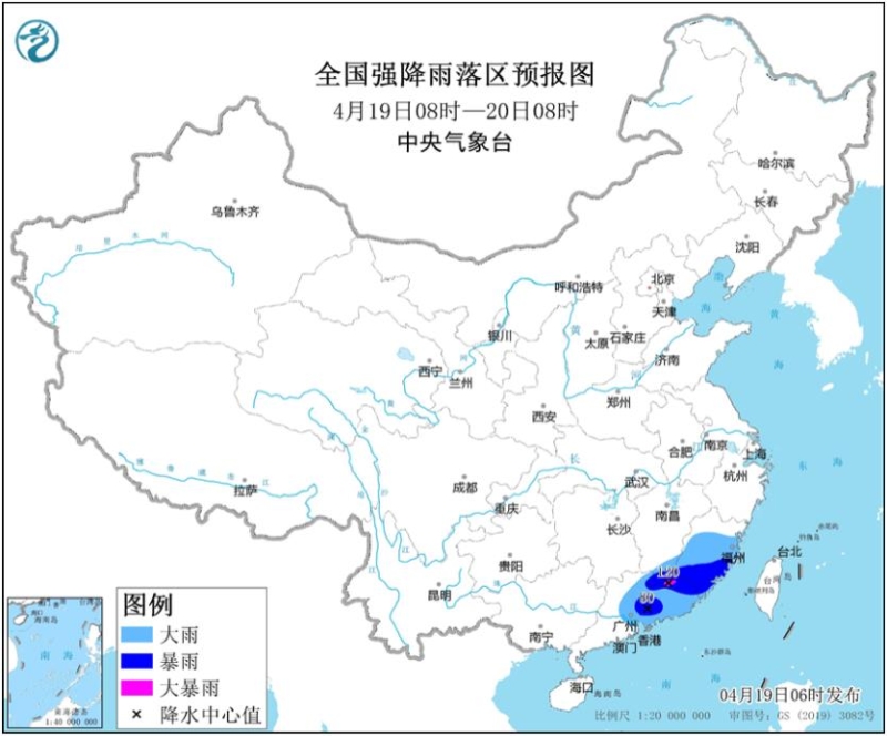 4月19日08時(shí)至20日08時(shí),江南東部和南部、華南北部等地部分地區(qū)有大到暴雨,其中,廣東中部和東北部、福建南部等地部分地區(qū)有大暴雨(100~120毫米)。上述部分地區(qū)伴有短時(shí)強(qiáng)降水(最大小時(shí)降雨量20~50毫米,局地可超過(guò)60毫米),局地并將伴有8-10級(jí)雷暴大風(fēng)或冰雹天氣。中央氣象臺(tái)4月19日06時(shí)繼續(xù)發(fā)布暴雨藍(lán)色預(yù)警和強(qiáng)對(duì)流天氣黃色預(yù)警。