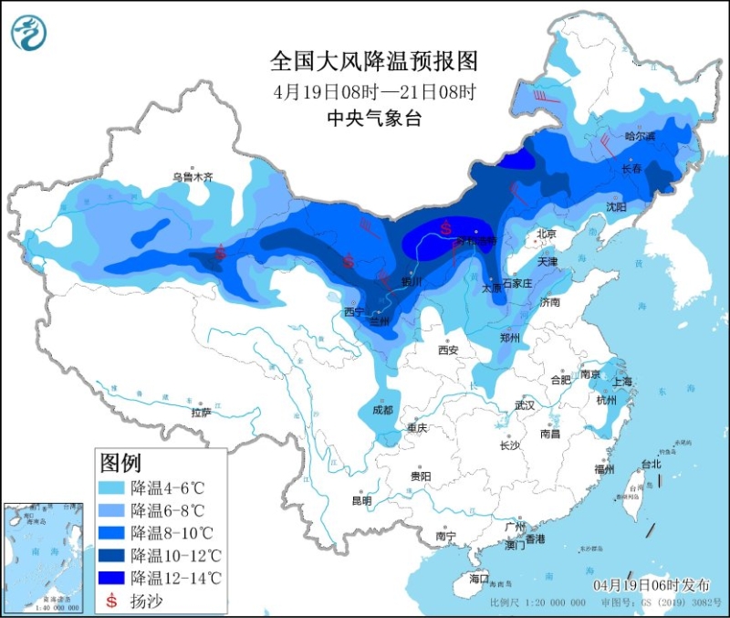 19日至23日,受強(qiáng)冷空氣影響,西北地區(qū)大部、華北、東北、黃淮、江漢、江淮、江南等地先后有4~6級(jí)風(fēng),陣風(fēng)8~10級(jí),新疆山口地區(qū)陣風(fēng)可達(dá)12級(jí);上述地區(qū)日平均氣溫先后下降6~10℃,部分地區(qū)降溫12~14℃,局地16℃以上。其中,4月19日08時(shí)至21日08時(shí),新疆南部、內(nèi)蒙古、青海北部和東部、甘肅、寧夏、陜西北部、山西、河北北部、東北地區(qū)中部等地氣溫將先后下降6~10℃,內(nèi)蒙古中部、山西北部等地局地降溫幅度可達(dá)12℃以上;上述地區(qū)有5~7級(jí)風(fēng),陣風(fēng)8~10級(jí),新疆南疆盆地和東部、西北地區(qū)大部、內(nèi)蒙古大部、華北北部、東北地區(qū)中西部等地有沙塵天氣。中央氣象臺(tái)4月19日06時(shí)繼續(xù)發(fā)布大風(fēng)降溫預(yù)報(bào)和沙塵暴藍(lán)色預(yù)警。