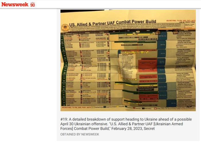 此外,在這些文件披露的圖表中,還顯示出烏克蘭軍隊(duì)預(yù)期的武器交付節(jié)點(diǎn)、部隊(duì)狀態(tài)及其他作戰(zhàn)計(jì)劃等內(nèi)容,表明美國(guó)在援助烏克蘭的過程中,已經(jīng)突破了此前宣稱的僅提供情報(bào)支持的界限。