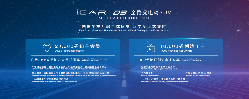 iCAR 03以業(yè)內(nèi)首創(chuàng)結(jié)構(gòu),定義新能源時(shí)代全路況出行體驗(yàn)。本屆上海車展,iCAR 03開啟全球創(chuàng)始車主招募活動(dòng),此次創(chuàng)始車主限額10000名,鉑金會(huì)員20000名,通過iCAR 汽車APP及iCAR官網(wǎng)即可搶訂,還有多重驚喜福利等待領(lǐng)取,未來將會(huì)有更多的車主朋友加入到iCAR的大家庭中,與品牌攜手共創(chuàng)美好車生活。同時(shí)iCAR聯(lián)合中國國家地理,開啟iCAR用戶專屬戶外路線探享先鋒官招募,旨在與追新年輕人共探精彩旅程。