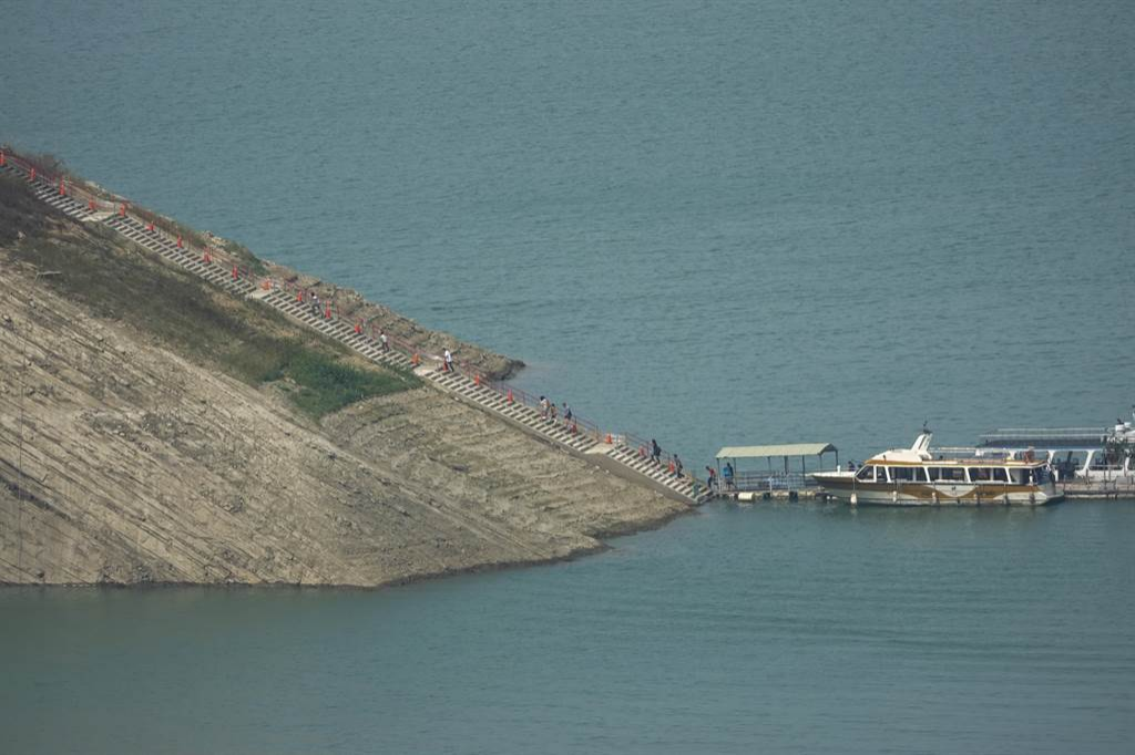 曾文水庫因水位下降,游艇碼頭隨著下移,游客搭船必須爬200余階樓梯上下,宛如爬一座小山頭。(黃子明攝)