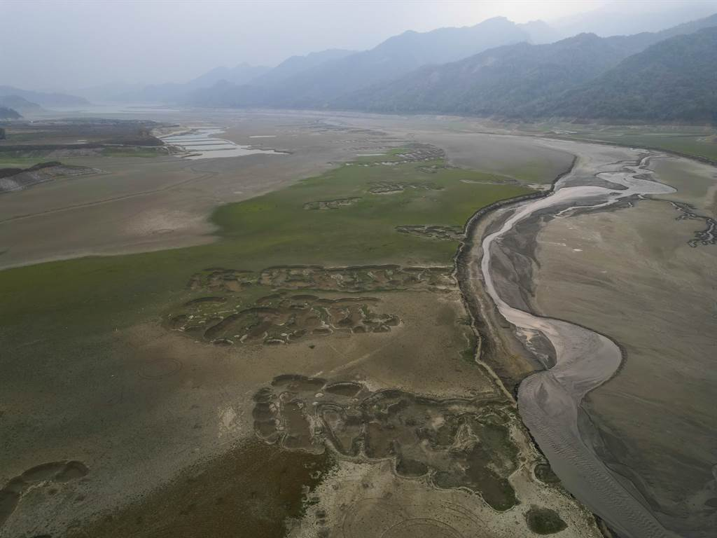 曾文水庫靠近嘉義大埔的庫區(qū),庫底有些區(qū)域土地干裂,甚至形成一片片草原。(黃子明攝)