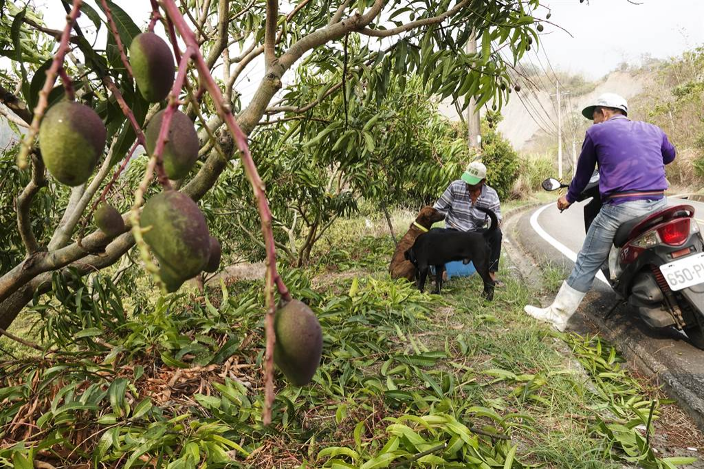 楠西謝姓果農(nóng)(左)表示,他的愛文芒果在過年前后開花,屬于早花,受到影響較小,許多果實(shí)已長到五、六公分以上,但也有落果情形。(黃子明攝)