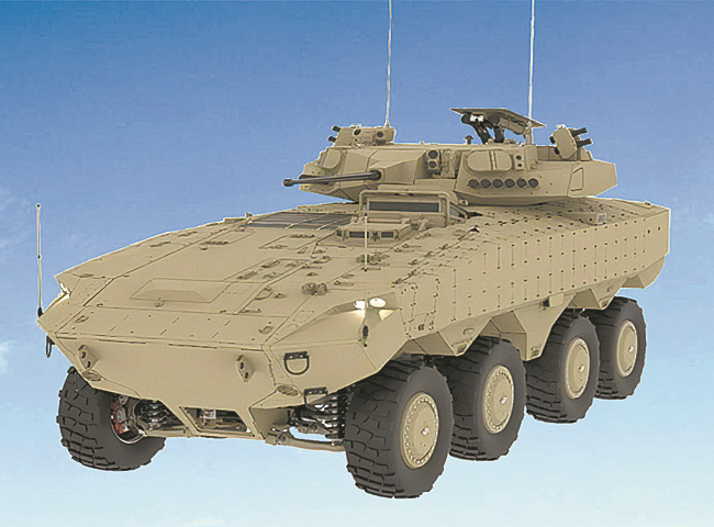 裝有輕量版“鐵拳”主動(dòng)防護(hù)系統(tǒng)的“埃坦”輪式裝甲車。資料圖片