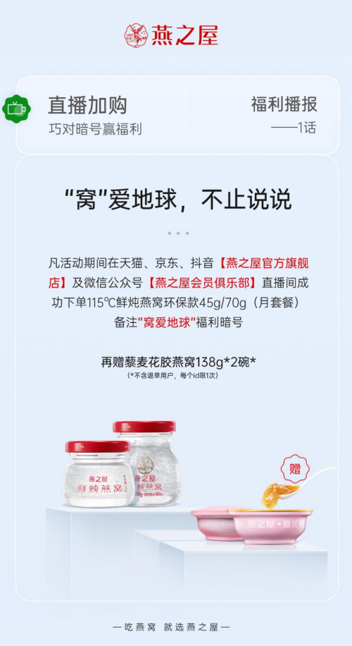 隨著對(duì)氣候問題的擔(dān)憂日益升級(jí),消費(fèi)者會(huì)更為謹(jǐn)慎,他們期望品牌在銷售的產(chǎn)品中主動(dòng)采取更為實(shí)際的低碳措施,并及時(shí)付諸行動(dòng)。為迎接世界地球日的到來,滿足注重環(huán)保的消費(fèi)者的可持續(xù)性要求,燕之屋聚焦燕之屋115℃鮮 鮮燉燕窩(環(huán)??睿耐瞥觥爸辈ゼ淤?gòu)”福利,凡活動(dòng)期間在天貓、京東、抖音【燕之屋官方旗艦店】直播間及微信公眾號(hào)【燕之屋會(huì)員俱樂部】成功下單燕之屋115℃鮮 鮮燉燕窩(環(huán)??睿?5g/70g(月套餐)并備注"窩愛地球"福利暗號(hào),即可再贈(zèng)藜麥花膠燕窩138g*2碗*(*不含退單用戶,每個(gè)id1次)。健康、高營(yíng)養(yǎng)、高品質(zhì)的燕窩產(chǎn)品結(jié)合“巧對(duì)暗號(hào)贏福利”活動(dòng),燕之屋打出了一套綠色環(huán)保的“組合拳”,讓環(huán)保觀念深入人心。天貓直播4月21日至23日,每天10:00-22:00;抖音直播4月21日至23日,每天7:30-24:00;京東直播4月21日下午15:30-19:30、4月22日至23日每晚19:00開始,敬請(qǐng)鎖定!