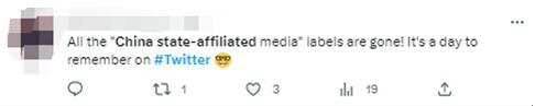 有網(wǎng)友稱,“所有‘中國官方媒體’的標簽都消失了!這是推特上值得紀念的一天?!?/p>