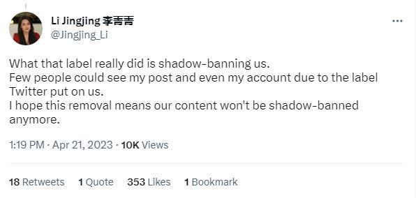 中國英文主持人李菁菁指出,推特的“官媒”標簽實際是一種“影子禁令”,為暗中設(shè)限提供方便。“由于推特給我們貼上了標簽,很少有人能看到我的帖子,甚至很難找到我的賬號。我希望這次刪除(標簽)意味著我們發(fā)布的內(nèi)容不會再被暗中禁止?!?/p>