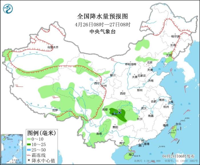 全國降水量預(yù)報(bào)圖(4月25日08時(shí)-26日08時(shí))