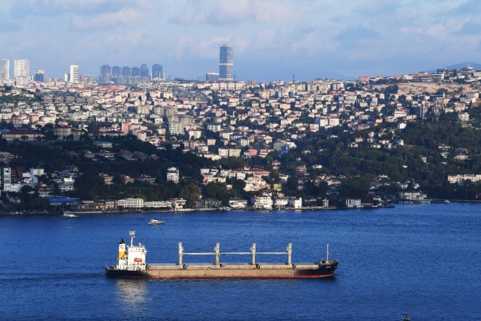 2022年8月7日,一艘從烏克蘭出發(fā)的運(yùn)糧船駛過土耳其伊斯坦布爾博斯普魯斯海峽。新華社記者沙達(dá)提攝