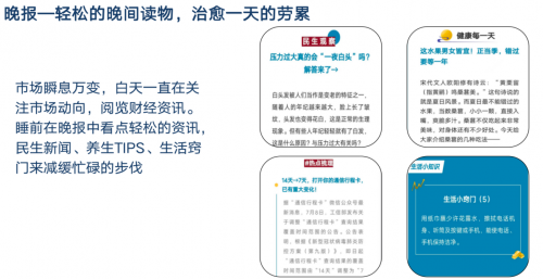 全時(shí)段財(cái)經(jīng)內(nèi)容,滿足理財(cái)經(jīng)理在各用戶空閑時(shí)間段觸達(dá)和投教客戶。