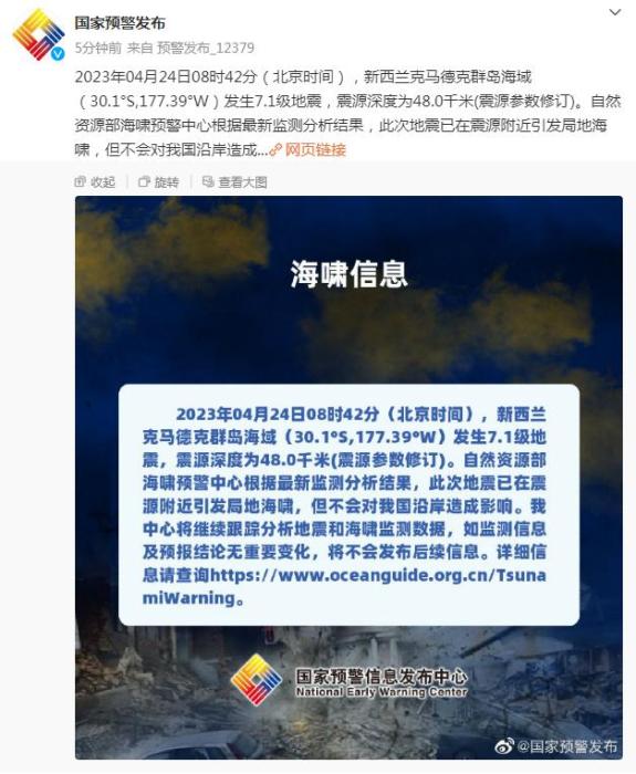 中新網(wǎng)4月24日電 據(jù)國家預(yù)警信息發(fā)布中心官方微博消息,4月24日08時42分(北京時間),新西蘭克馬德克群島海域(30.1°S,177.39°W)發(fā)生7.1級地震,震源深度為48.0千米(震源參數(shù)修訂)。