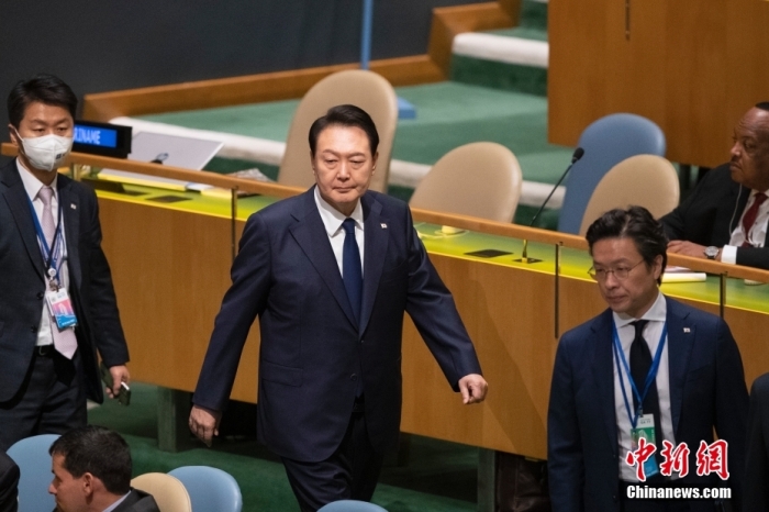 當?shù)貢r間2022年9月20日,第77屆聯(lián)合國大會一般性辯論在紐約聯(lián)合國總部開幕,韓國總統(tǒng)尹錫悅進入會場準備大會發(fā)言。 中新社記者 廖攀 攝