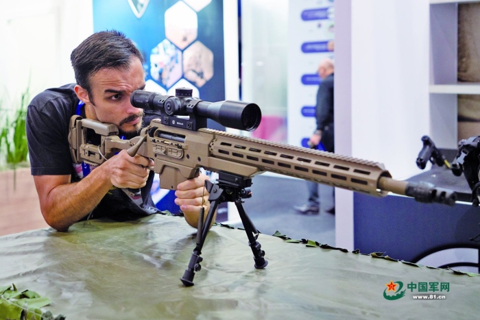 一名參觀者在巴西防務(wù)展上體驗(yàn)操作狙擊步槍的偵瞄系統(tǒng)。