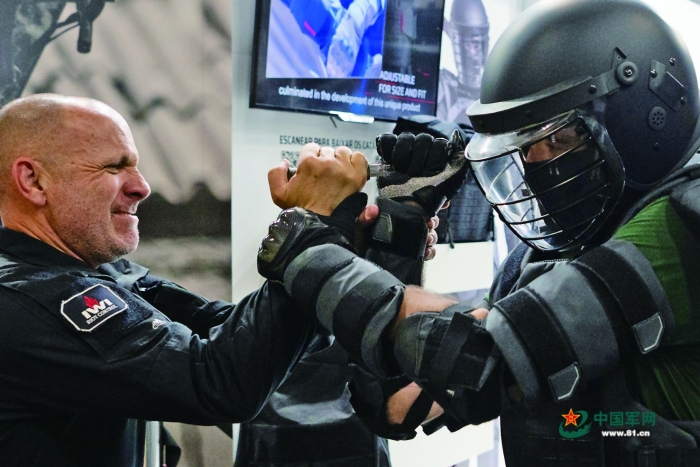 工作人員在巴西防務(wù)展上展示一款防刺服。
