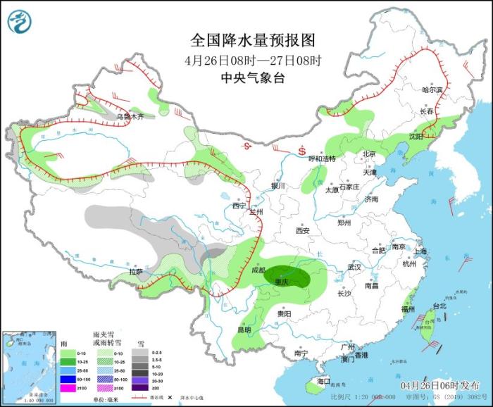 4月26日08時(shí)至27日08時(shí),新疆沿天山地區(qū)和南疆西部山區(qū)、西藏南部和東部、青海南部、甘肅河西、川西高原北部等地部分地區(qū)有小到中雪或雨夾雪;新疆南疆盆地西部、西藏東南部、甘肅河西、陜西北部、內(nèi)蒙古中部、吉林東部、遼寧中東部、華北北部、四川中東部、重慶大部、貴州中北部、云南東部、湖南西北部、湖北西南部、海南島、臺(tái)灣島等地部分地區(qū)有小到中雨。新疆北部、西北地區(qū)東部、內(nèi)蒙古中西部、黑龍江東部等地部分地區(qū)有4~6級(jí)風(fēng),其中,新疆東部等地部分地區(qū)有6~7級(jí)風(fēng)(見圖1)。臺(tái)灣海峽、巴士海峽、臺(tái)灣以東洋面將有6~7級(jí)、陣風(fēng)8級(jí)的風(fēng)。