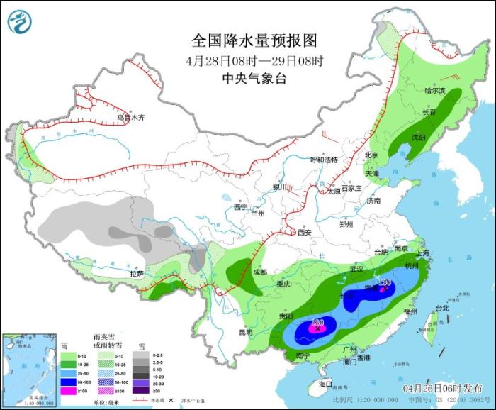 4月28日08時(shí)至29日08時(shí),新疆南疆西部山區(qū)、西藏北部和東部、青海西部、川西高原北部、內(nèi)蒙古東北部等地部分地區(qū)有小到中雪或雨夾雪;貴州東南部、湖南東部和南部、江西大部、浙江西南部、福建西部和北部、廣西中北部、廣東西北部等地部分地區(qū)有大到暴雨,其中,廣西東北部、江西東部等地部分地區(qū)有大暴雨(100~130毫米)。西北地區(qū)東部、內(nèi)蒙古、華北西部和北部等地部分地區(qū)有5~7級(jí)風(fēng)。渤海海峽將有4~5級(jí)、陣風(fēng)6級(jí)的偏南風(fēng)轉(zhuǎn)6~7級(jí)、陣風(fēng)8級(jí)的西北風(fēng)(見圖3)。