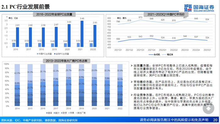 國(guó)海證券發(fā)布的研報(bào)顯示,2020年疫情之前,全球PC出貨量穩(wěn)定在2.6億臺(tái)左右,在2022年達(dá)到出貨量峰值為3.3億臺(tái)。