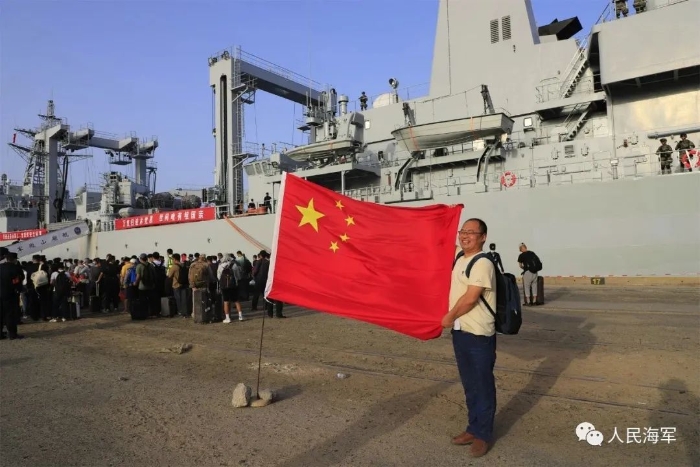 ↑當(dāng)?shù)貢r(shí)間4月26日,海軍軍艦赴蘇丹緊急撤離我在蘇丹人員。圖為撤離人員登艦前與國(guó)旗合影。丁家興 攝