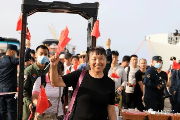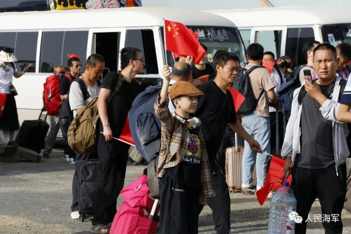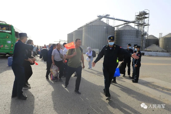 在官兵期待的目光中,當(dāng)?shù)貢r(shí)間16時(shí)40分許,搭載首批撤離人員的大巴車隊(duì)拖著揚(yáng)起的塵土安全抵達(dá)碼頭?!坝H愛的同胞們,大家辛苦了!請(qǐng)大家放心,我們來(lái)了,大家安全了!”編隊(duì)指揮員的親切問候,讓連日奔波的撤離人員感受到了久違的安寧。