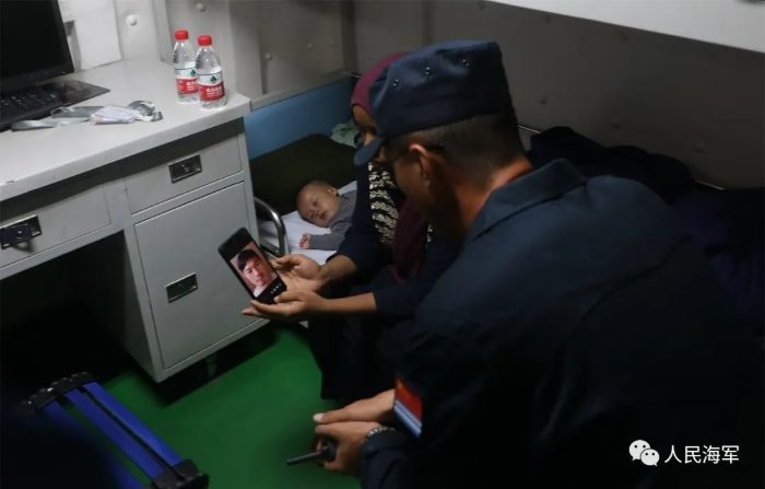 ↑當(dāng)?shù)貢r(shí)間4月26日,海軍軍艦赴蘇丹緊急撤離我在蘇丹人員。圖為海軍官兵安頓登艦人員后,登艦人員向海軍官兵展示手機(jī)里家人照片。劉姝含 攝